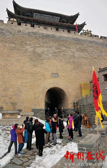 “兩節(jié)”過(guò)后的雁門關(guān)景區(qū),一片銀裝素裹讓南來(lái)北往的游客沉醉在山舞銀蛇、關(guān)樓雄壯、長(zhǎng)城如蟒的北國(guó)風(fēng)光之中,體驗(yàn)邊塞生活,抒發(fā)懷古幽情。圖為游客在雁樓前停留。(石俊文 攝)