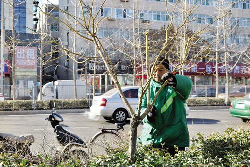 冬去春來,近日,我市園林處組織養(yǎng)護(hù)工人,集中修剪城區(qū)內(nèi)凍傷的喬灌木枯枝,確保這些樹木在春天里更好地生長(zhǎng)發(fā)芽,美化城市。圖為園林部門的工作人員正在和平街上對(duì)樹木進(jìn)行修剪。(張志遠(yuǎn) 攝)