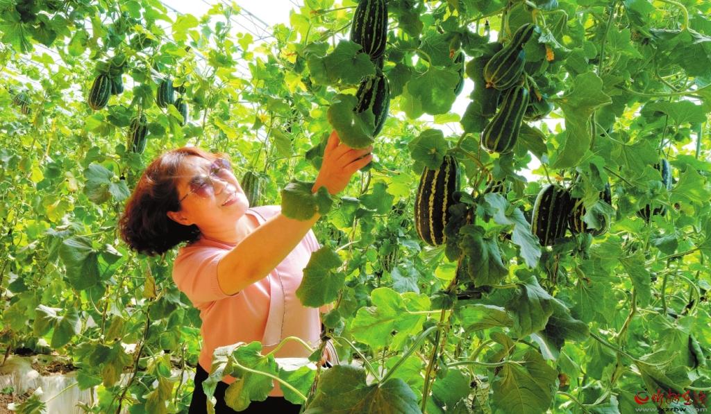 定襄縣大南莊村香瓜種植專業(yè)戶利用南瓜根系嫁接香瓜新技術(shù),實(shí)現(xiàn)了穩(wěn)產(chǎn)增產(chǎn),畝均收益5萬(wàn)元以上。圖為游客在采摘香瓜。(張晉蘭攝)