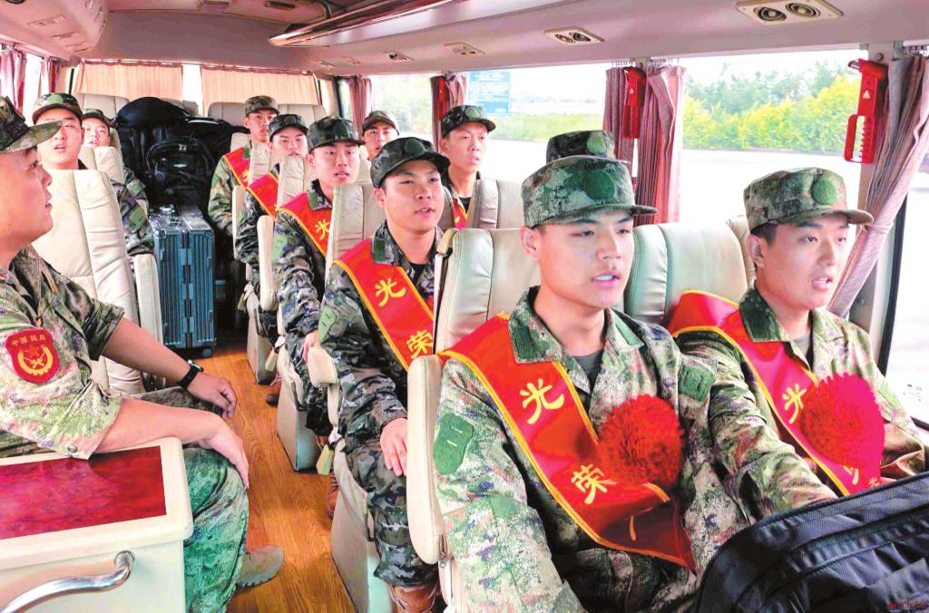 近日,定襄縣開展新兵入伍送兵活動(dòng)。中巴車內(nèi),身著迷彩服的新兵們佩戴“光榮”綬帶與大紅花,精神抖擻、目光堅(jiān)定。這輛承載著殷切期望的專車,將正式送他們踏上從軍報(bào)國(guó)的新征程。(郭婧蕾攝)