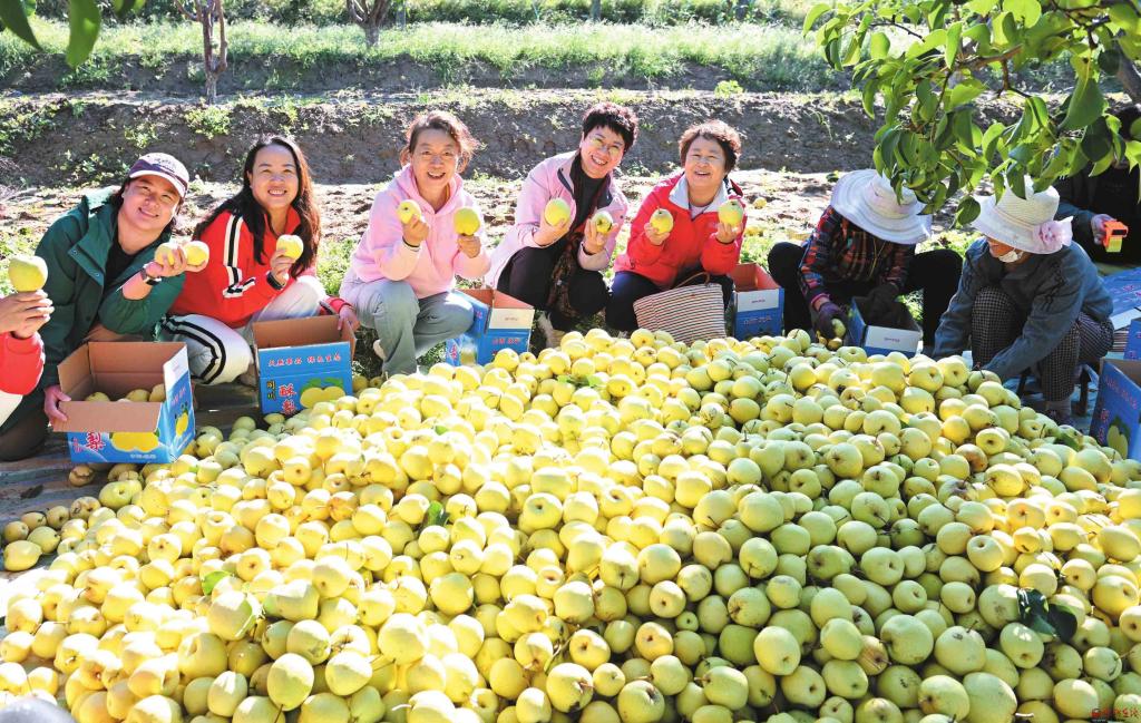 定襄縣北社東村、北社西村一帶盛產(chǎn)酥梨。由于交通便利,金秋十月吸引了眾多觀光客前來(lái)采摘。田間地頭,梨樹(shù)之下,一派豐收景象。(張晉蘭 攝)