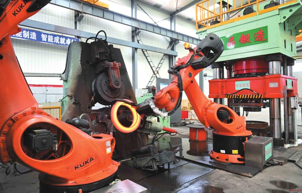 定襄縣秉持“綠色發(fā)展,科技創(chuàng)新”理念,大力推進(jìn)法蘭鍛造行業(yè)的裝備升級(jí)換代,變精密制造為智能制造。全縣二十多家企業(yè)實(shí)現(xiàn)生產(chǎn)智能化改造,生產(chǎn)效率提高了百分之五,成本降低了百分之六,經(jīng)濟(jì)效益大幅提高。圖為山西良品鍛造有限公司法蘭流水線機(jī)器人智能化生產(chǎn)作業(yè)。(張晉蘭攝