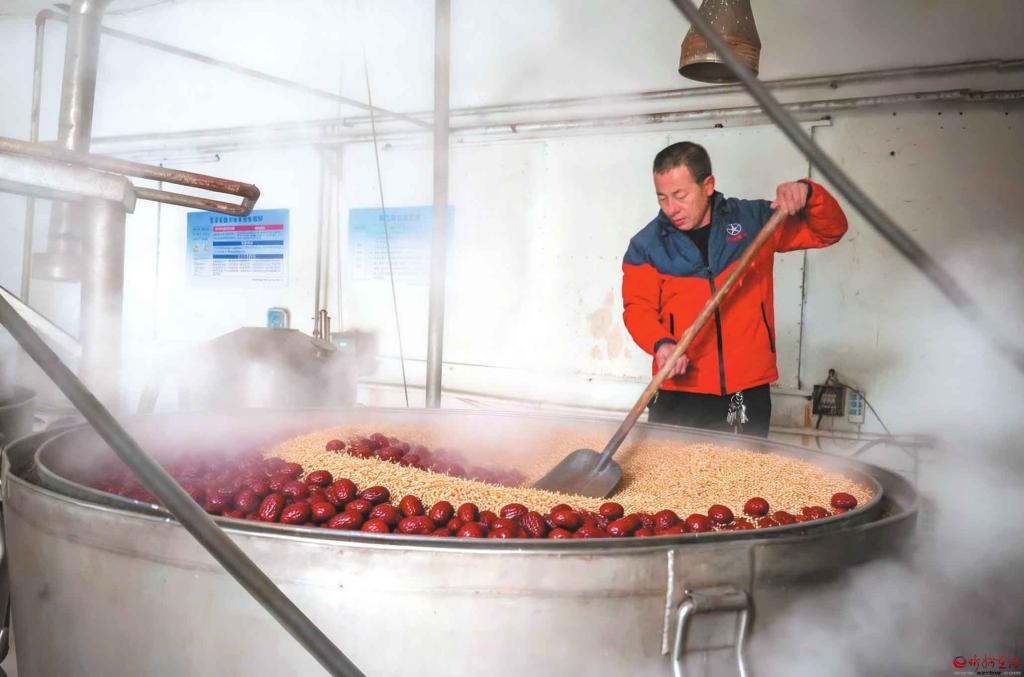 近年來,保德縣貢棗酒開發(fā)基地以“保德油棗”與枸杞入酒,不僅更好地保留了果實的溫補特性,也釀出了獨特的地方風(fēng)味。該基地不僅是當(dāng)?shù)赝苿蛹t棗產(chǎn)業(yè)深加工、提升附加值的關(guān)鍵項目,也是將地理標(biāo)志農(nóng)產(chǎn)品轉(zhuǎn)化為特色商品、助力鄉(xiāng)村振興的生動實踐。圖為保德縣貢棗酒基地,工人在蒸餾車間翻動攪拌麥殼與紅棗等原料,車間內(nèi)蒸汽彌漫。(記者 范琛攝)