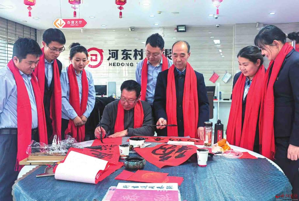 新春到來之際,神池縣河?xùn)|村鎮(zhèn)銀行邀請(qǐng)當(dāng)?shù)貢◥酆谜咴跔I(yíng)業(yè)大廳現(xiàn)場(chǎng)揮毫潑墨,為前來辦理業(yè)務(wù)的客戶書寫春聯(lián),深受群眾稱贊。(楊晉明攝)