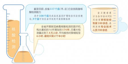 利用核酸檢測開展大范圍篩查,是精準(zhǔn)防控疫情的有效手段。省衛(wèi)健委醫(yī)政醫(yī)管局四級調(diào)研員趙宏介紹,全省開展新冠病毒核酸檢測的醫(yī)療機(jī)構(gòu)從最初的14所增加到174所,日最大檢測量達(dá)到7.4萬人份,平均報(bào)告時(shí)限縮短至6小時(shí),最短只需2個(gè)半小時(shí)。