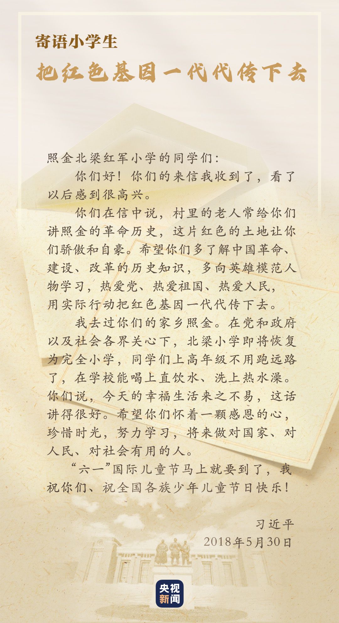校舍變新了,師資變強(qiáng)了,不變的是代代相傳的紅色基因。總書記的回信,激勵(lì)著這里的孩子傳承紅色基因,回報(bào)社會(huì),用光熱溫暖更多人,把愛傳遞出去。