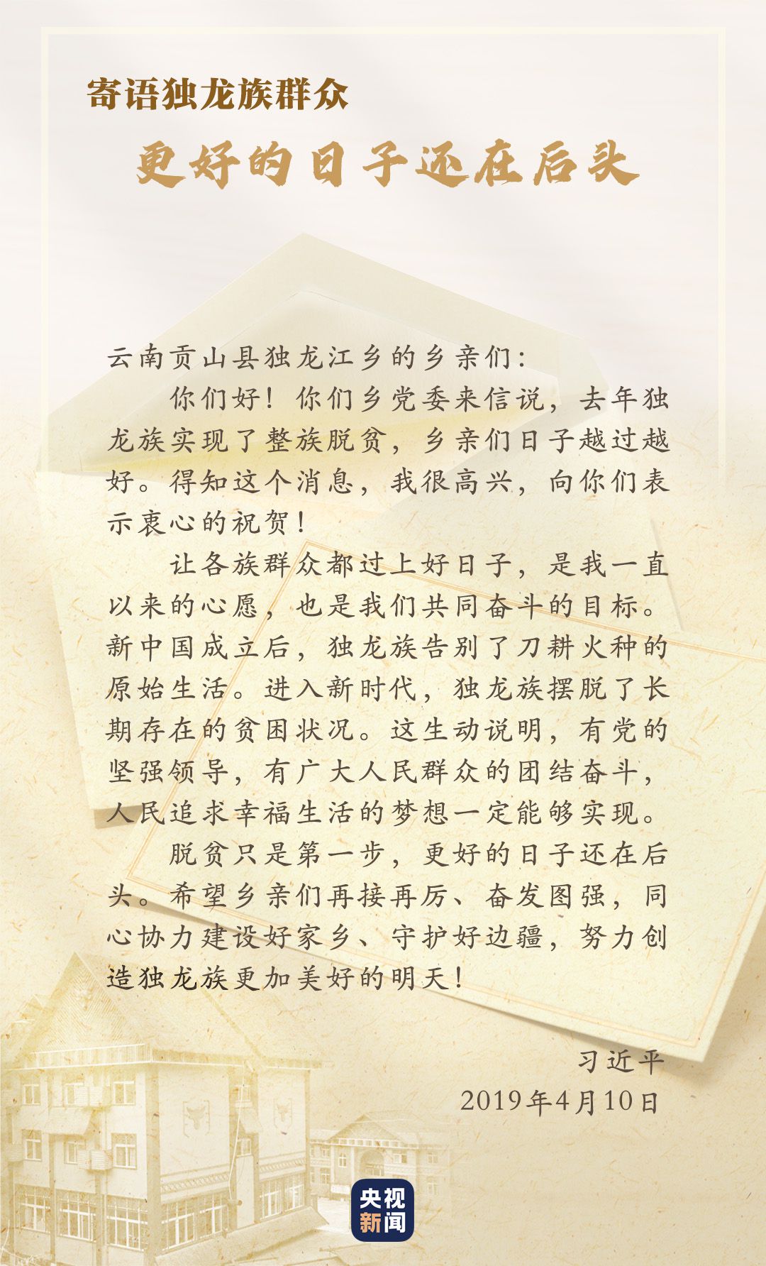 2018年,獨(dú)龍江鄉(xiāng)6個(gè)行政村整體脫貧,獨(dú)龍族實(shí)現(xiàn)整族脫貧,基礎(chǔ)設(shè)施、特色產(chǎn)業(yè)、社會(huì)事業(yè)等都發(fā)生了巨大變化。貢山縣干部群眾再次給習(xí)近平寫信匯報(bào)脫貧成績(jī),習(xí)近平得知后非常高興,向他們表示“衷心的祝賀”,并勉勵(lì)鄉(xiāng)親們?yōu)檫^上更加幸福美好的生活繼續(xù)團(tuán)結(jié)奮斗。