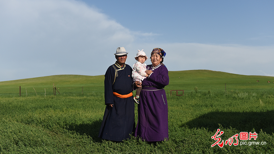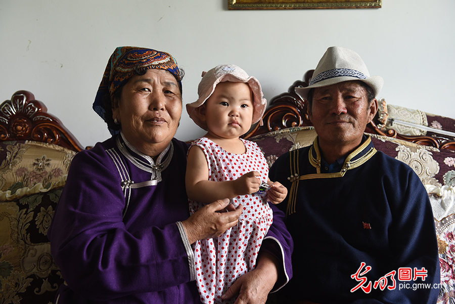 除了偶爾參加旗里的黨員活動(dòng),其日麥拉圖和老伴每日的生活就是含飴弄孫、養(yǎng)牛養(yǎng)馬,日子過得愜意又自在。圖為2020年8月2日,其日麥拉圖夫婦和小孫女在自家客廳合影留念。(潘迪攝/光明圖片)