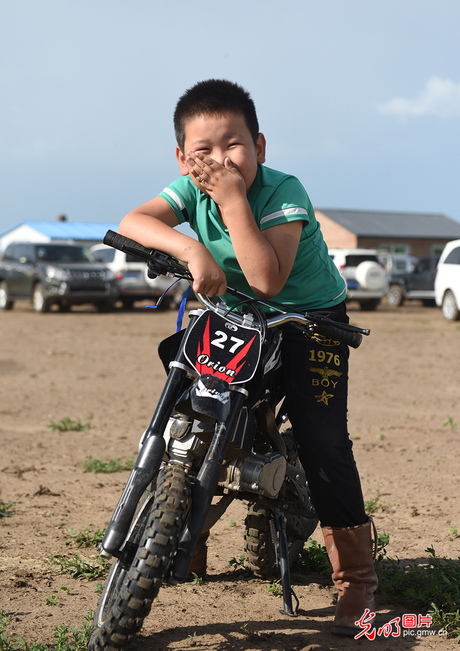 其日麥拉圖的大孫子時(shí)常會(huì)來爺爺家。對(duì)他而言,胯下的兒童玩具車就是他的“駿馬”,爺爺家的牧場(chǎng)就是他的后花園。圖為2020年8月2日,其日麥拉圖的孫子在牧場(chǎng)玩耍。(潘迪攝/光明圖片)