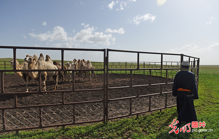 在陳巴爾虎旗,每一個(gè)牧民都以家里養(yǎng)著“五畜”為榮。五畜,及綿羊、山羊、牛、馬和駱駝。除了十幾頭駱駝,其日麥拉圖家里還養(yǎng)著90多匹馬,1000多只山羊、綿羊,100多頭牛,真正實(shí)現(xiàn)了五畜興旺。圖為2020年8月2日,其日麥拉圖巡視駱駝群的健康情況。(潘迪攝/光明圖片)