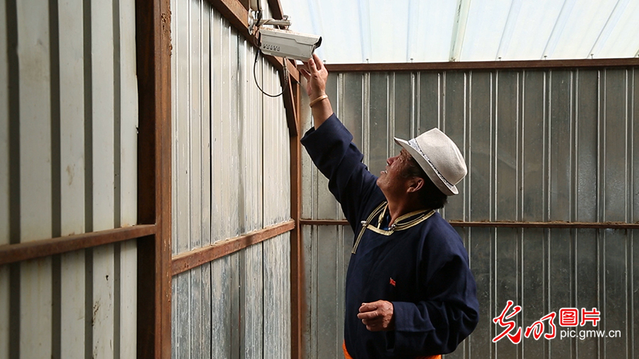 為了第一時(shí)間掌握到牲畜的情況,在其日麥拉圖的帶領(lǐng)下,許多牧民都在自家的牛舍、羊圈里安裝了監(jiān)控。圖為2020年8月2日,其日麥拉圖查看羊圈里監(jiān)控?cái)z像頭的運(yùn)轉(zhuǎn)情況。(李剛攝/光明圖片)