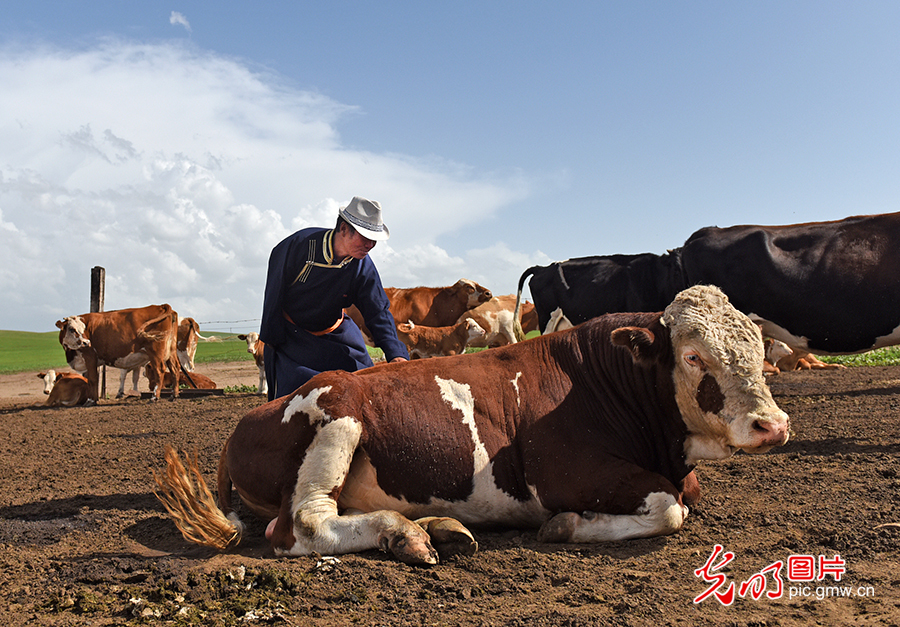 八年來,其日麥拉圖帶領(lǐng)牧民投入到嘎查牧業(yè)生產(chǎn)和生態(tài)建設(shè)中,使得牧民收入逐年提高,成為全旗機(jī)械化程度最高、疫病防治和棚圈建設(shè)最好的嘎查。圖為2020年8月2日,其日麥拉圖在查看自家養(yǎng)的牛。(潘迪攝/光明圖片)
