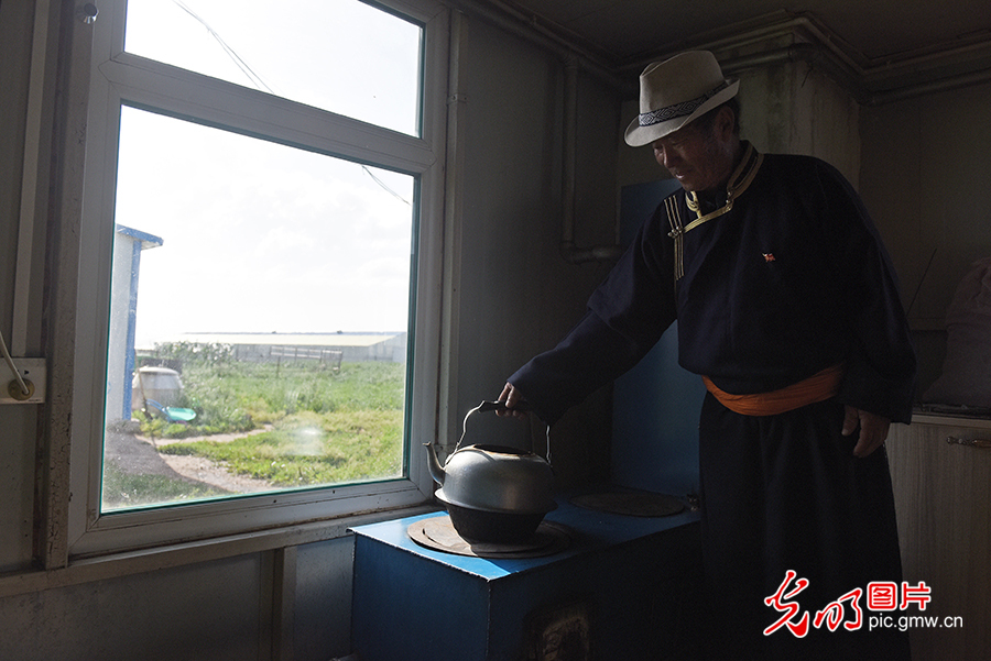 精準(zhǔn)脫貧政策實(shí)施以來,在政府的幫助下,其日麥拉圖家在草原上蓋了新房子,生活用品一應(yīng)區(qū)全,其日麥拉圖一家逐漸擺脫了逐水草而居、隨季節(jié)而變的游牧生活。圖為2020年8月2日,其日麥拉圖在家里燒水。(潘迪攝/光明圖片)