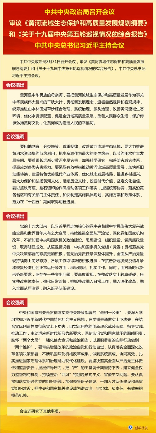 新華社北京8月31日電 中共中央政治局8月31日召開會議,審議《黃河流域生態(tài)保護(hù)和高質(zhì)量發(fā)展規(guī)劃綱要》和《關(guān)于十九屆中央第五輪巡視情況的綜合報(bào)告》。中共中央總書記習(xí)近平主持會議。