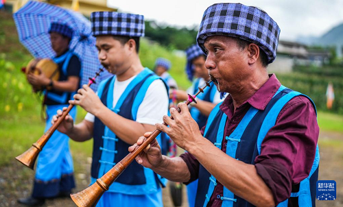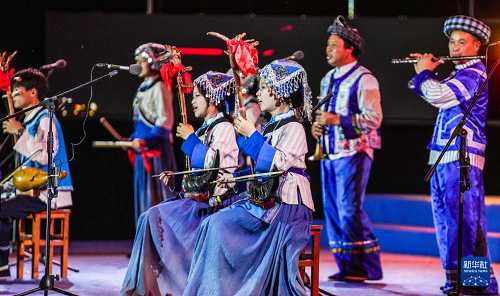 黔西南布依族苗族自治州的布依族群眾在表演《八音坐唱》(6月29日攝)。(新華社記者 陶亮 攝)