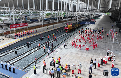 7月1日在延安站拍攝的西延高鐵軌道貫通儀式(無人機(jī)照片)。(新華社記者 張博文 攝)