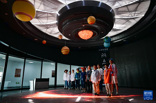 7月29日,參加暑期研學的小朋友在冷湖鎮(zhèn)“冷湖實驗室”學習天文知識。(新華社記者 張龍 攝)