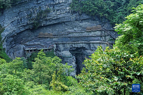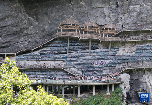 這是8月9日拍攝的廣西河池市羅城仫佬族自治縣棉花天坑景區(qū)內(nèi)的懸崖書店。(新華社發(fā) 龍濤 攝)
