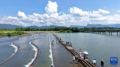 8月11日,游人在浙江省臺州市仙居縣永安溪白塔鎮(zhèn)段游玩(無人機照片)。(新華社發(fā) 王華斌 攝)