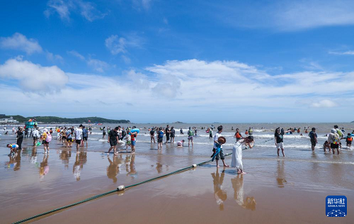 8月12日,游客在朱家尖南沙景區(qū)沙灘上游玩。(新華社記者 徐昱 攝)