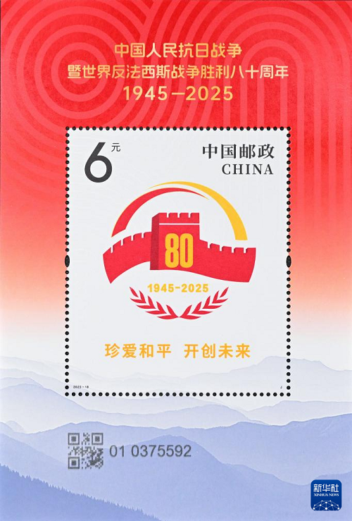 這是9月3日拍攝的《中國人民抗日戰(zhàn)爭暨世界反法西斯戰(zhàn)爭勝利八十周年》紀念郵票小型張。(新華社記者 李賀 攝)