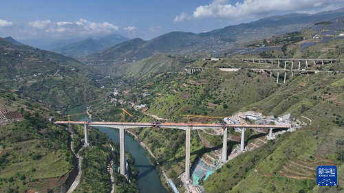 9月7日在云南省昭通市魯?shù)榭h江底鎮(zhèn)拍攝的渝昆高鐵江底牛欄江特大橋合龍現(xiàn)場(無人機照片)。(新華社發(fā) 張廣玉 攝)
