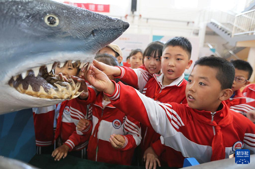9月8日,在甘肅省定西市舉辦的“山海相依,筑夢蔚藍”山東青島·甘肅定西海洋科普東西部協(xié)作主題活動中,定西市安定區(qū)關(guān)川實驗學(xué)校的學(xué)生在觀看海洋生物標本。(新華社發(fā) 王克賢 攝)
