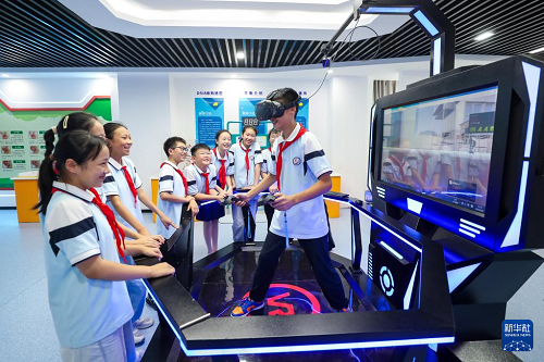 9月8日,江蘇省泰州市姜堰區(qū)淮海小學(xué)學(xué)生在校園科技館體驗VR項目。(新華社發(fā) 周社根 攝)
