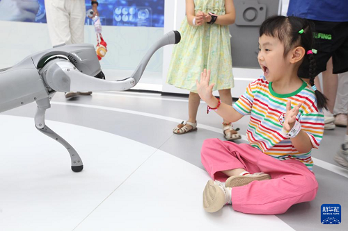 9月7日,在位于江蘇省徐州市云龍區(qū)的一家科學(xué)探索館,小朋友與機器狗互動。(新華社發(fā) 蒯創(chuàng) 攝)