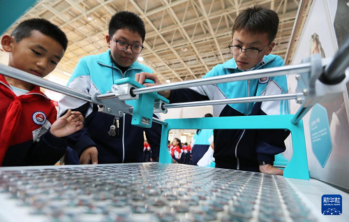 9月8日,在甘肅省定西市舉辦的“山海相依,筑夢蔚藍”山東青島·甘肅定西海洋科普東西部協(xié)作主題活動中,定西市安定區(qū)關(guān)川實驗學(xué)校的學(xué)生在流動科技館內(nèi)體驗科普裝置。(新華社發(fā) 王克賢 攝)