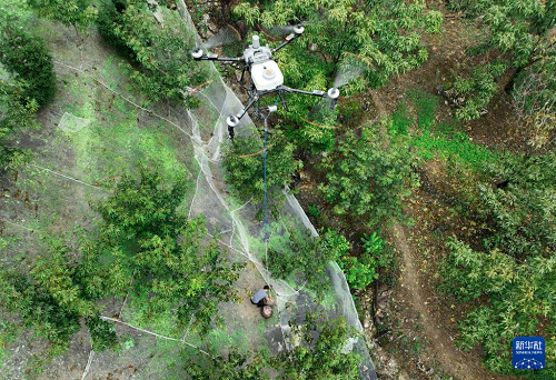 9月9日,在臨安島石鎮(zhèn)的一片山核桃林上方,農(nóng)用無人機(jī)將采收的山核桃運(yùn)送出山(無人機(jī)照片)。(新華社記者 翁忻旸 攝)