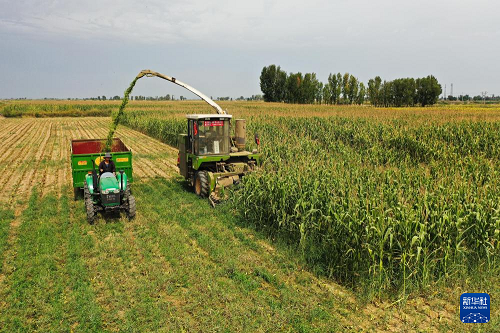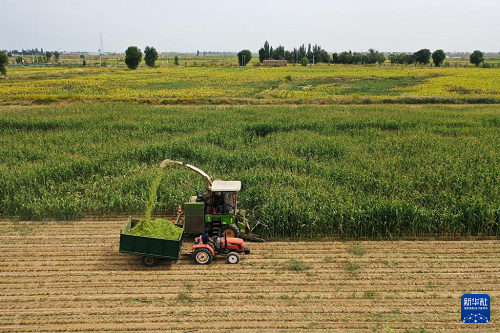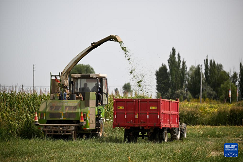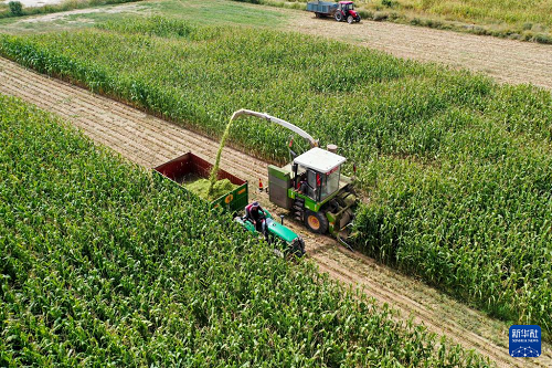 9月11日,農(nóng)機手操作農(nóng)機在杭錦旗吉日嘎朗圖鎮(zhèn)格更召嘎查田間收割青貯玉米。(新華社記者 李志鵬 攝)