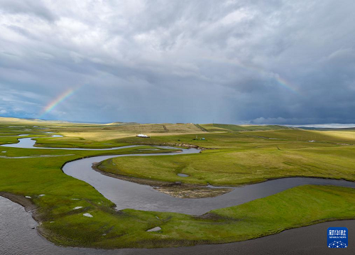 9月14日在內(nèi)蒙古呼倫貝爾市陳巴爾虎旗拍攝的彩虹下的莫爾格勒河(無(wú)人機(jī)照片)。(新華社記者 馬金瑞 攝)