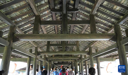 9月25日,游人行走在三江侗族自治縣程陽(yáng)永濟(jì)橋上。(新華社記者 張楓 攝)