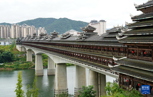這是9月25日拍攝的三江侗族自治縣的宜陽(yáng)風(fēng)雨橋。該橋橫跨潯江之上,全長(zhǎng)399.6米,寬28米。橋面設(shè)雙向四車(chē)道,橋上共兩層,二層建有跨橋人行通道。(新華社記者 張楓 攝)