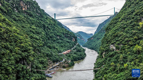 景區(qū)內(nèi)的索道橋與遠(yuǎn)處的花江峽谷大橋遙相呼應(yīng)(9月27日攝,無(wú)人機(jī)照片)。(新華社記者 陶亮 攝)