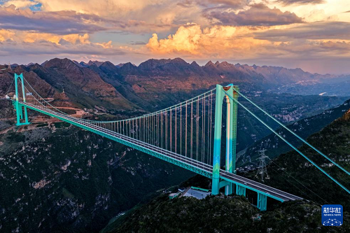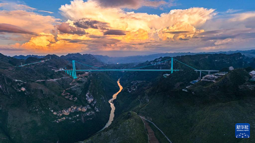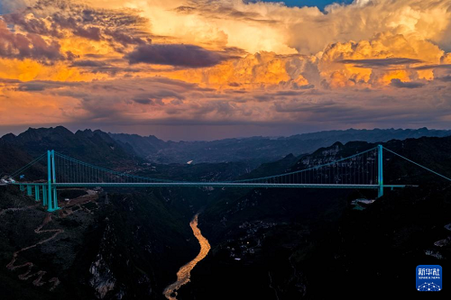 花江峽谷大橋是貴州六枝至安龍高速公路的控制性工程,大橋全長2890米,主跨1420米,是目前世界山區(qū)峽谷第一大跨度鋼桁梁懸索橋;其橋面距水面垂直高度625米,超越北盤江第一橋成為新的世界第一高橋,被譽(yù)為“橫豎都是第一”。在不同時(shí)段的光線下,世界第一高橋呈現(xiàn)出不同的美景。