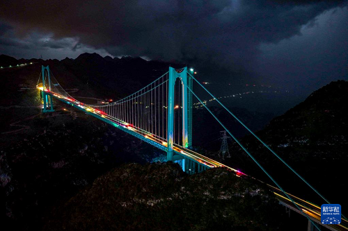 9月28日拍攝的夜幕下的貴州花江峽谷大橋(無人機(jī)照片)。(新華社記者 楊文斌 攝)