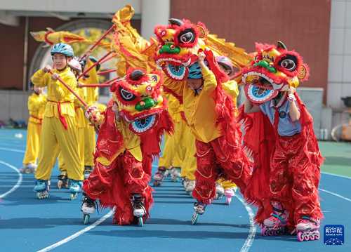 9月29日,在山東省榮成市實驗小學,孩子們表演舞龍舞獅。(新華社發(fā) 李信君 攝)