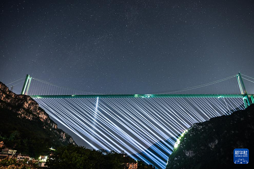 夜晚,新的世界第一高橋——貴州花江峽谷大橋呈現(xiàn)出不同光影美景,吸引游客前來(lái)觀賞。
