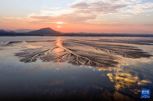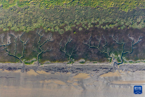 這是10月11日在浙江嘉興海寧拍攝的錢塘江退潮后的“潮汐樹”(無人機照片)。(新華社記者 徐昱 攝)