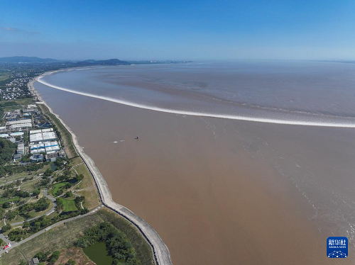 10月10日拍攝的錢塘江大潮(無人機照片)。(新華社記者 徐昱 攝)