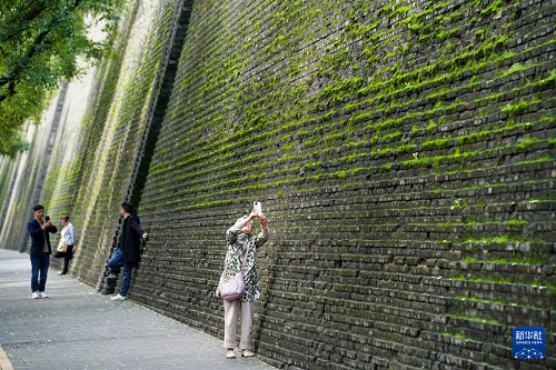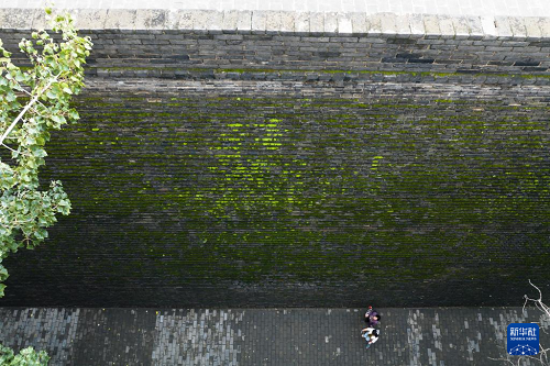 西安城墻始建于隋唐、擴(kuò)建于明代,是中國現(xiàn)存歷史最悠久、保存最完整的古代城垣建筑。連綿秋雨過后,苔蘚等植物為西安城墻披上了一層綠色的外衣,吸引市民和游人駐足觀看、拍照。