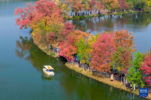 11月2日,游客在江蘇南京中山植物園月牙堤上賞秋游玩(無人機(jī)照片)。(新華社發(fā) 史俊 攝)