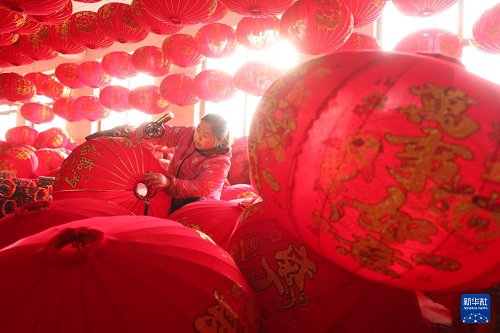 12月10日,工人在河北省石家莊市藁城區(qū)屯頭村一家宮燈廠制作宮燈。(新華社發(fā) 梁子棟 攝)