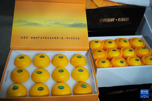 這是12月11日在浙江省慶元縣竹口鎮(zhèn)黃壇水干果園區(qū)內拍攝的分裝好的甜桔柚禮盒。(新華社記者 劉梓漪 攝)