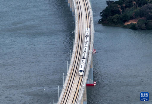 這是12月22日拍攝的行駛在汕頭濠江特大橋上的高鐵列車(chē)。(新華社發(fā) 姚軍 攝)