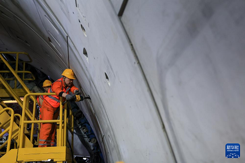1月6日,中鐵十四局施工人員在“深江1號”盾構(gòu)機(jī)上進(jìn)行管片螺栓緊固工作。(新華社記者 毛思倩 攝)