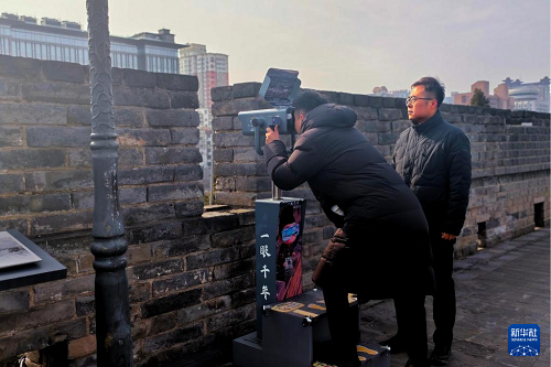 2026年1月5日,趙彬(右)在西安城墻上檢查城墻的“一眼千年”AR望遠(yuǎn)鏡設(shè)備。新華社發(fā)