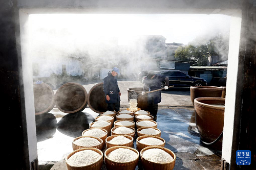 1月11日,在浙江省東陽(yáng)市馬宅鎮(zhèn)屠梁村鐘山自然村,釀酒師傅在撈米。(新華社發(fā) 胡揚(yáng)輝 攝)